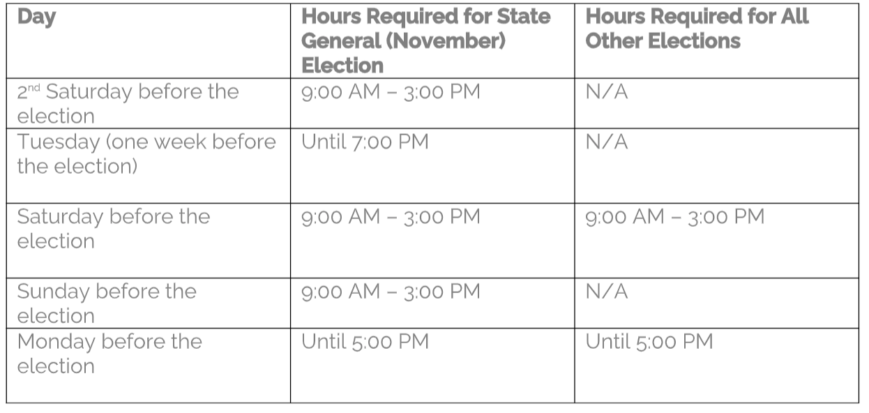 Absentee and Mail ballots may be returned by mail or in person up to and including election day. The Auditor/Treasurer’s office is open for early voting Monday through Friday 7:30 a.m. – 4 p.m. Refer to the chart for additional early voting opportunities: